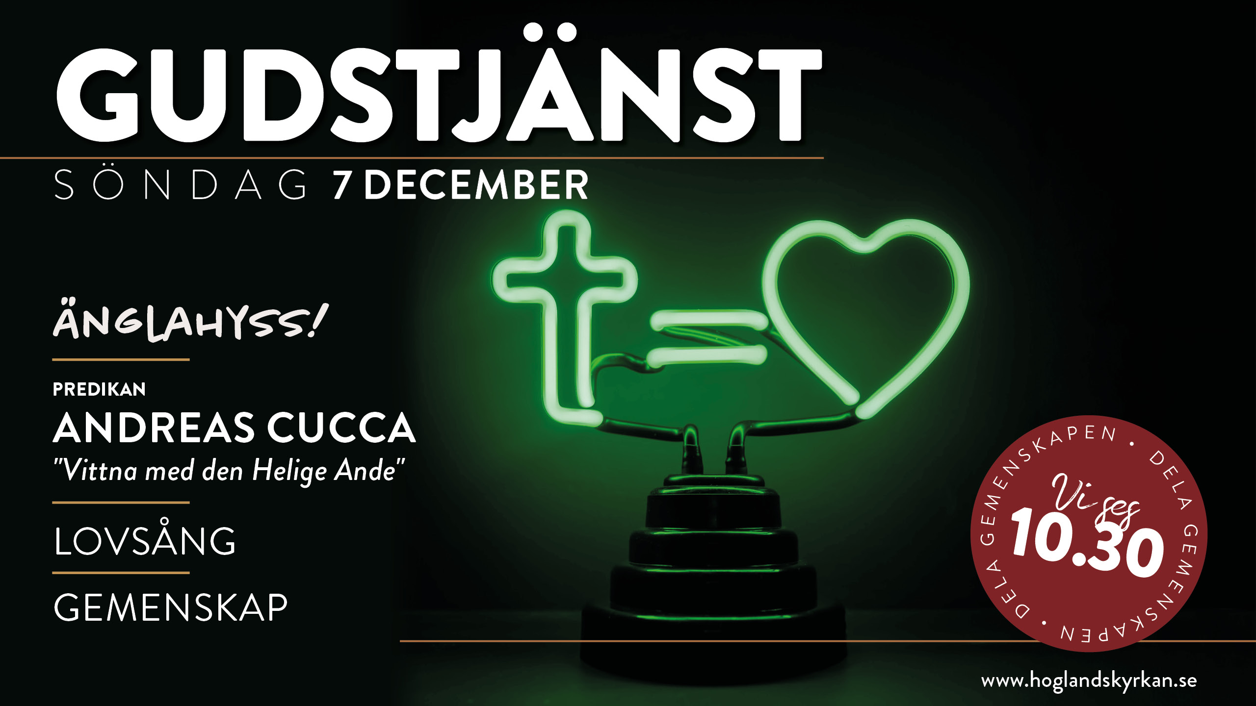 Välkommen till gudstjänst! Lovsång, förbön och gemenskap. Idag välkomnar vi Andreas Cucca, missionär som predikar om att vittna med den Helige Ande. Vi ses söndag, med start kl 10.30.