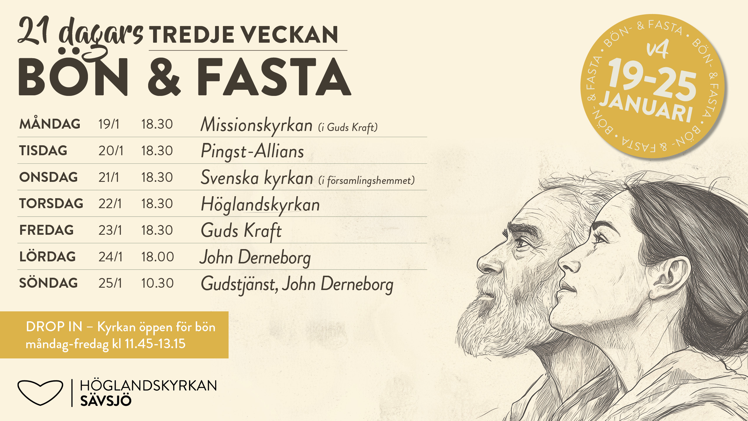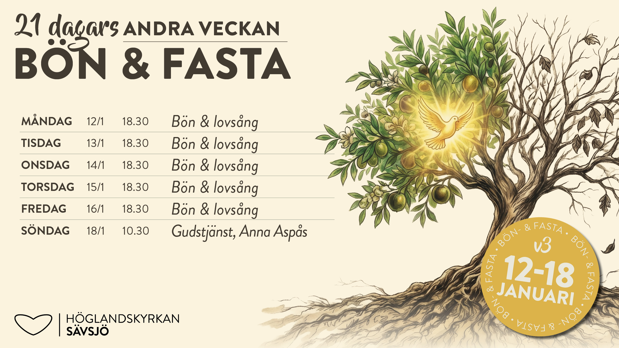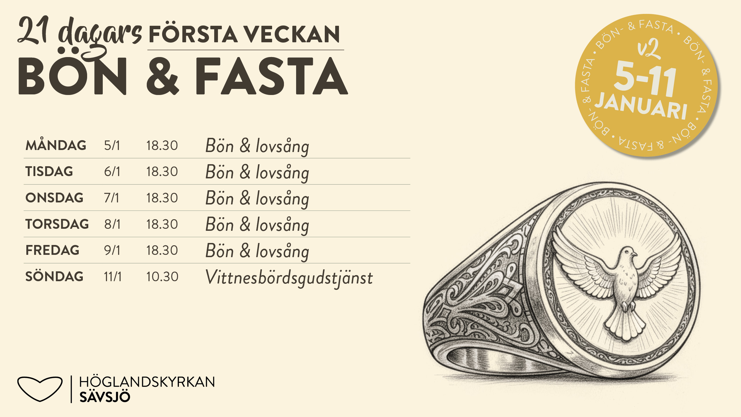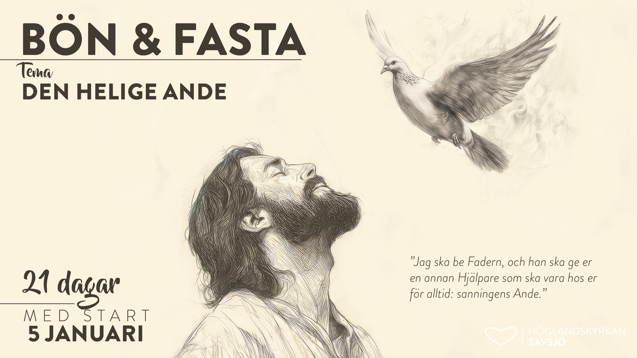 Vi går in i årets efterlängtade bön- och fasteperiod. Med start måndagen den 5 januari lägger vi ett större fokus på den helige Ande. Kyrksalen blir en plats för gemensam lovsång och kreativ bön.